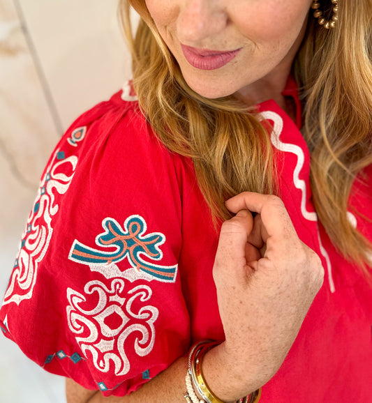 Tomato Red Embroidered Puff Sleeve Dress